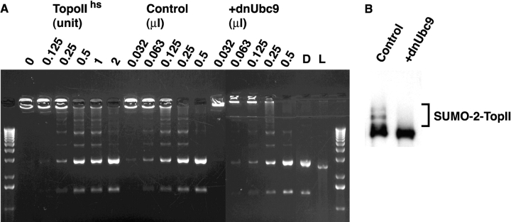 Figure 4. dnUbc9 does not alter decatenation activity of Xenopus topoisomerase II. (A) Chromosomal proteins were prepared from sperm chromatin assembled with or without 150 ng/μl dnUbc9 and assayed for decatenation activity as described in Materials and methods. Serial dilutions of chromosomal proteins were performed, in order to add the equivalent of the volumes indicated in each lane into decatenation reactions. For comparison, reactions were performed using purified human topoisomerase II, with the number of manufacturer's unit per reaction indicated. A fully decatenated marker was loaded in the lane marked D, and a linearized marker was loaded in the lane marked L. The lane marked 0 shows kinetoplast DNA from a control reaction without added chromosomal proteins. (B) Western blot of chromosomal eluates from extracts without (left) or with (right) dnUbc9 used in the decatenation reaction.