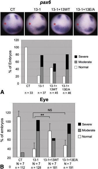 Fig. 2. ADAM13 metalloproteinase activity is required for eye field formation and eye morphology. One dorsal-animal blastomere of 8-cell stage embryos was injected with the indicated MO (1.5 ng) and, as indicated, rescue mRNA encoding wild-type or the E/A mutant of ADAM13 (25 pg). (A) Embryos were allowed to develop to stage ~12.5 and then processed by in situ hybridization for pax6. A representative embryo of each injection is shown in the upper panels (the injected side is denoted with a red asterisk), and combined results summarized in graphs. (B) Embryos were scored for eye phenotype at stage ~35. **, pb0.001; NS, not significant (p=0.28). See Fig. 1A and Materials and methods for phenotype scoring.