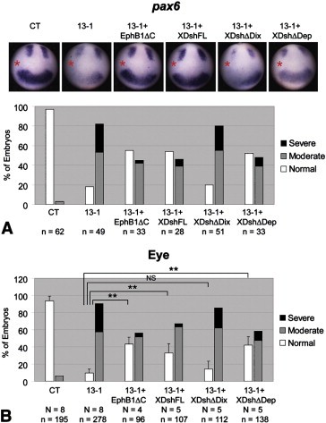 ig. 3. Effects of ADAM13 MO on eye development can be rescued by blocking EfnB sig- naling or by restoring canonical Wnt signaling. One dorsal-animal blastomere of 8-cell stage embryos was injected with the indicated MO (1.5 ng) and, as indicated, with 100 pg mRNA encoding EphB1δC, or full-length (FL) or deleted forms of Xdsh. (A) Embryos were cultured to stage ~ 12.5 and then processed by in situ hybridization for pax6. The injected side is denoted with a red asterisk. (B) Embryos were scored for eye phe- notype at stage ~ 35. **, p b 0.001 in each case; NS, not significant (p = 0.17). See Fig. 1A and Materials and methods for phenotype scoring.