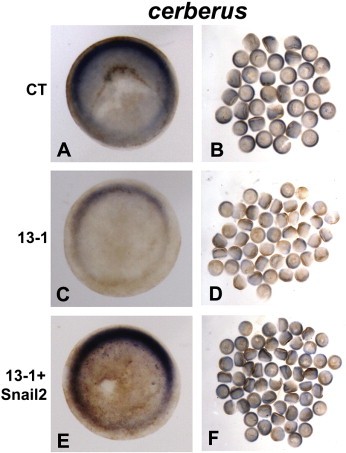 Fig. 5. ADAM13 controls cerberus expression through Snail2. One-cell stage embryos were injected with 12 ng of MO CT (A and B) or 13-1 (C and D), or MO 13-1 with 1 ng mRNA encoding Snail2 (E and F), and cultured to stage ~11. In situ hybridization was carried out for cerberus, and embryos were cleared with 2:1 benzyl benzoate/ benzyl alcohol before photographed. One representative embryo of each injected group is shown in animal pole view (with dorsal at the top) in the left panels, and all embryos of each injected group are shown in the right panels.