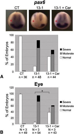 Fig. 6. The effects of ADAM13 knockdown on pax6 expression and eye morphology can be rescued by Cerberus. One dorsal-animal blastomere of 8-cell stage embryos was injected with the indicated MO (1.5 ng) with or without an mRNA encoding Cerberus (50 pg). Embryos were allowed to develop and then processed by in situ hybridization for pax6 (stage ~12.5; A), or scored for eye phenotype (stage ~35; B). See Fig. 1A and Materials and methods for phenotype scoring. *, p=0.02