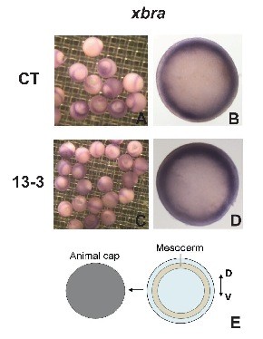Supplementary Fig. 3. Knockdown of ADAM13 has no apparent influence on xbra expression. One-cell stage embryos were injected with the indicated MO (12 ng each), and cultured to stage ~11. In situ hybridization was carried out for xbra, and multiple embryos of the same injection groups are shown in A and C. Embryos were also sectioned as illustrated in E (with animal cap removed to reveal the staining of xbra in mesoderm), and one representative example of each group is shown in B and D (animal pole views with dorsal at the top).