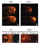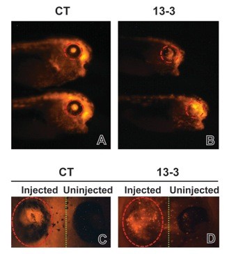 Supplementary Fig. 7. Knockdown of ADAM13 does not affect the contribution of D1.1 blastomere to the eye field. The D1.1 blastomere of 16-cell stage embryos was injected with the indicated MO (0.75 ng) together with red Dextran, as described in Material and Methods. Embryos were cultured to stage 37/38 and analyzed for the presence of red fluorescence in the eyes. (A and B) Injected side of whole embryos showing fluorescence in the eye field. Note the lack of eye pigments in 13-3 morphants. (C and D) Cross sections of the eyes of control (CT; C) and 13-3 (D) morphants showing fluorescence on the injected side. Red dashed circles indicate the eye field, and green dotted lines demarcate the midline of the embryos.