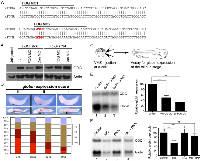 Figure 1. FOG is required for primitive erythropoiesis in Xenopus laevis.(A) Alignment of sequence surrounding the translation start site of the two Xenopus FOG alleles. Sequences to which FOG MOs bind are indicated by the black bars and the ATG start codon is in red. (B) Western blot of lysates from embryos injected with MYC epitope tagged wild type xFOG or xFOGr RNA, which harbors silent mutations that prevent MO binding, with either FOG MO or Control MO. Note that FOG MOs inhibit the translation of xFOG-MYC RNA but do not affect translation of xFOGr-MYC RNA. Actin is shown as a loading control. (n = 3) (C) Schematic of experimental design. MO and/or RNA is targeted to the ventral marginal zone (VMZ) of an eight-cell embryo. Injected embryos are cultured to the tailbud stage and assayed for globin expression by whole mount in situ hybridization or Northern analysis. (D) In situ hybridization analysis of globin expression (purple stain) in embryos injected with increasing doses of FOG MO (n = 4). Arrowheads indicate the anterior-most aspect of the VBI, derived from dorsal cells not targeted by injections. (E) Northern analysis of globin expression in embryos injected with increasing doses of FOG MO (n≥3). (F) Northern analysis of globin expression in embryos injected with FOG MO (40 ng), xFOGr RNA (200 pg), or both (n≥4). Levels of globin expression are normalized to expression of the housekeeping gene ODC and reported as a percentage of control in the graphs in panel E and F. Error bars reflect S.D. Paired t test results are as follows: **, p≤0.005; ***, p≤0.0005.