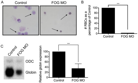Figure 4. FOG morphants show a loss of circulating RBCs and altered RBC morphology.(A) Wright-Giemsa stain of blood cells from wild type and FOG MO injected embryos. Black arrows indicate primitive RBCs. (B) Graph showing the number of circulating RBCs in tadpoles injected with FOG MO at the eight-cell stage as compared to their wild type siblings. The number of RBCs is expressed as a percentage of control (n = 4). (C) Northern analysis of globin expression in stage 42 uninjected control and FOG MO injected embryos. Levels of globin expression are normalized relative to expression of ODC and reported as a percentage of control (n = 6). Error bars reflect S.D. Paired t test results are as follows: ***, p≤0.0005.