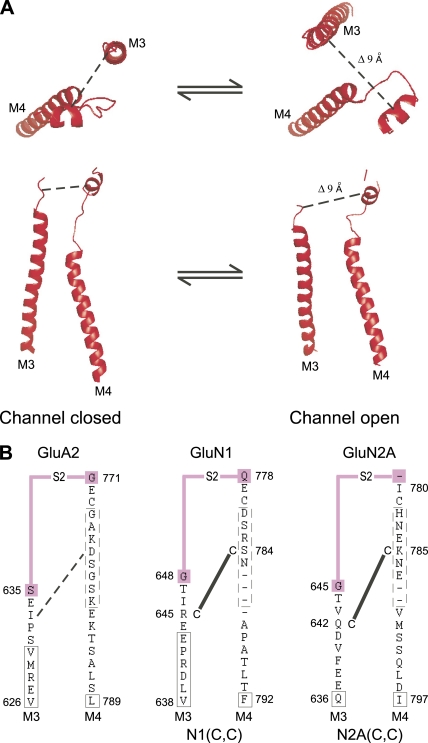 The defining functional feature of N-methyl-d-aspartate (NMDA) receptors is activation gating, the energetic coupling of ligand binding into opening of the associated ion channel pore. NMDA receptors are obligate heterotetramers typically composed of glycine-binding GluN1 and glutamate-binding GluN2 subunits that gate in a concerted fashion, requiring all four ligands to bind for subsequent opening of the channel pore. In an individual subunit, the extracellular ligand-binding domain, composed of discontinuous polypeptide segments S1 and S2, and the transmembrane channel-forming domain, composed of M1-M4 segments, are connected by three linkers: S1-M1, M3-S2, and S2-M4. To study subunit-specific events during pore opening in NMDA receptors, we impaired activation gating via intrasubunit disulfide bonds connecting the M3-S2 and S2-M4 in either the GluN1 or GluN2A subunit, thereby interfering with the movement of the M3 segment, the major pore-lining and channel-gating element. NMDA receptors with gating impairments in either the GluN1 or GluN2A subunit were dramatically resistant to channel opening, but when they did open, they showed only a single-conductance level indistinguishable from wild type. Importantly, the late gating steps comprising pore opening to its main long-duration open state were equivalently affected regardless of which subunit was constrained. Thus, the NMDA receptor ion channel undergoes a pore-opening mechanism in which the intrasubunit conformational dynamics at the level of the ligand-binding/transmembrane domain (TMD) linkers are tightly coupled across the four subunits. Our results further indicate that conformational freedom of the linkers between the ligand-binding and TMDs is critical to the activation gating process.