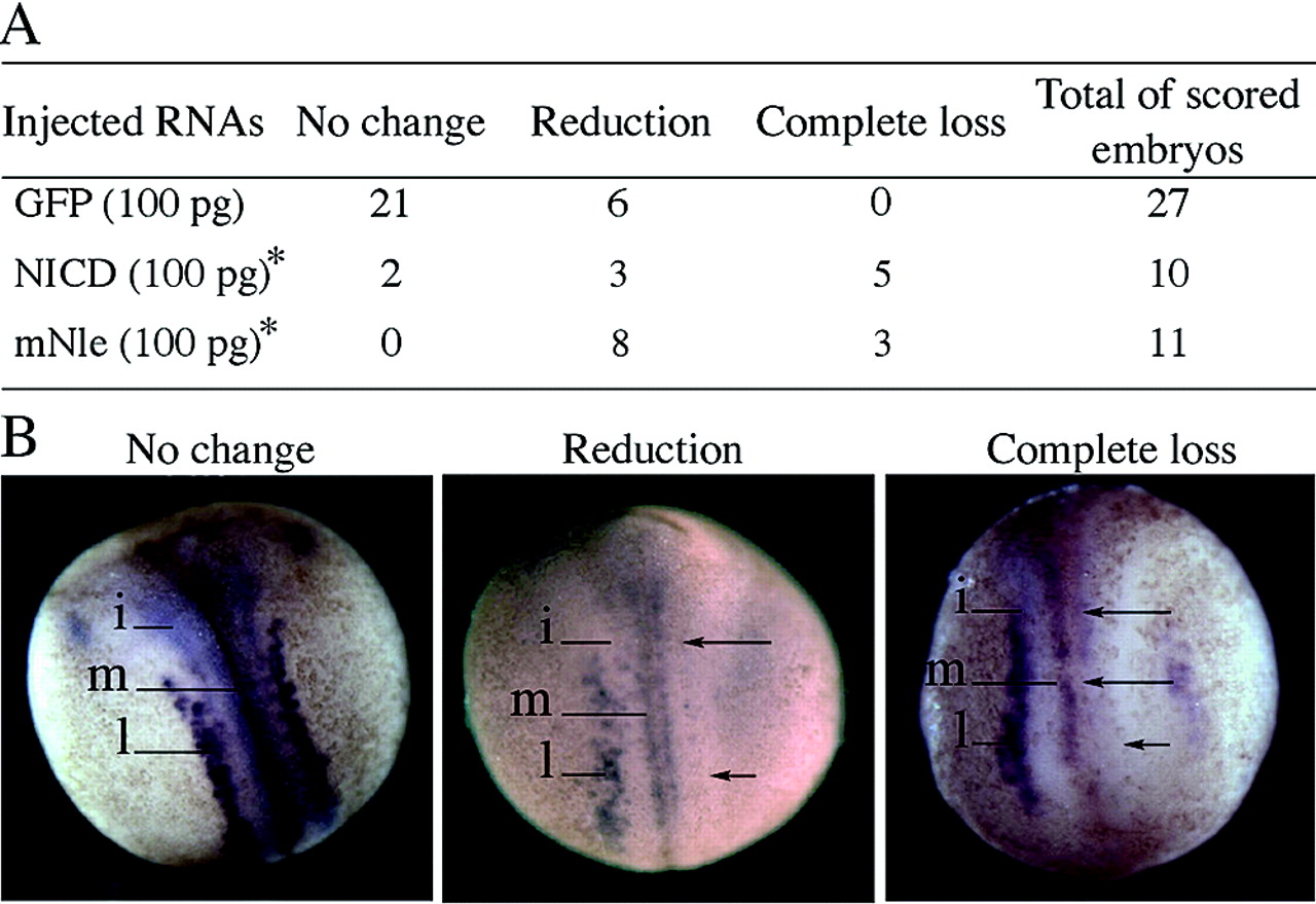 FIG. 2. Effect of GFP, NICD, and mNle RNA injections on the production of primary neurons in Xenopus embryos. Injected embryos (stage 16) were monitored for the N-tubulin expression pattern. (A) Number of embryos that present, in the injected side compared to the noninjected side, no change, reduction, or complete loss of N-tubulin-positive neurons. *, analysis of distribution of the three N-tubulin expression profiles between NICD and GFP (Ï2, 0.001 < P < 0.01) and between mNle and GFP (Ï2, P < 0.001). (B) Examples of the three types of N-tubulin expression patterns obtained after RNA injections. Dorsal views are shown with the anterior end up. The injected side is shown on the right side of the images. N-tubulin expression was detected in primary neurons of medial (m), intermediate (i), and lateral (l) stripes in the noninjected side. Arrows indicate the reduction or complete loss of N-tubulin expression. |