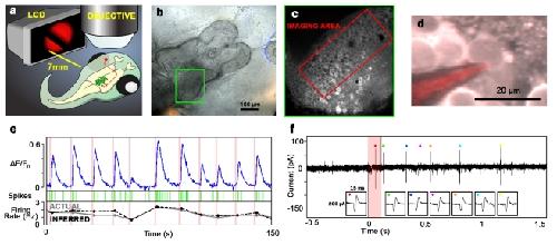 Figure 1. In vivo imaging of evoked network activity in the unanesthetized developing brain.(a) Experimental setup. Motion stimuli were presented to the left eye of awake, immobilized Xenopus tadpoles while imaging the right optic tectum. Neurons in the tectum (green circles) extend dendrites to receive visual input from retinal ganglion cells (red) of the contralateral eye. (b) Transmitted light image of a tadpole brain seen through the head. Green box, optic tectum. (c) Two-photon image of optical section corresponding to green box in (b). Tectum is loaded with OGB1-AM, a calcium-sensitive dye. Red box corresponds to the region of tectum monitored in our experiments. (d) Two-photon image of a patched neuron in awake tectum. (e) Simultaneous recording of somatic fluorescence (ÎF/F0, top) and action potentials (green) in response to full field light stimuli of varying intensity, with actual (gray) and inferred (black) firing rates in the 5 s following each stimulus. (f) Expanded voltage trace for electrophysiological recording. Pink shading marks time of stimulus. The electrical transients bounding the stimulus period are clipped. Colored dots mark individual action potentials, which are magnified in the boxes at bottom. |