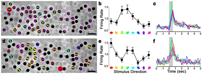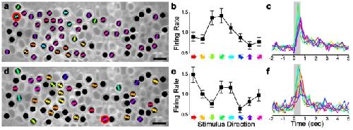Figure 2. Orientation and direction responses in optic tectum.(a,d) Maps of direction and orientation selectivity in naive Xenopus tectum obtained through rapid two-photon imaging and firing rate inference. Stimuli were dark bars moving over a light background for 600 ms in eight directions. Black circles mark neurons that responded significantly to stimuli. Colored arrows mark preferred directions (a) and orientations (d) of neurons showing stimulus specificity. Coronal optical section, rostrum to the left. Scale bar = 20 µm. (b,e) Tuning curves of a direction- (b) and an orientation- (e) selective neuron highlighted in (a,d). Error bars denote SEM. (c,f) Average temporal response of the two neurons to each stimulus direction. Colors match those in (b,e). Gray bar marks time of stimulus presentation. All measures calculated from n = 48 stimulus presentations for each of eight directions (1 h). |