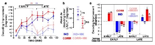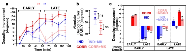 Figure 5. Training induces NMDAR-dependent improvement of whole-network encoding.(a) Time course of noise-correlation–based (red) and independent (blue) decoding performance. Light curves, improvement is blocked by MK-801. Bars denote early and late epochs. Decoding improvement is the decrease in decoding error relative to the independent decoder at the first timepoint. Both decoders improved from early to late epochs in control, but not MK-801–treated tadpoles (paired t-tests). (b) Decoding error of control (left, blue) and MK-801–treated (right, red) tadpoles over first hour of stimulation. Lighter shades denote decoding using the optimal independent decoder, darker shades mark noise correlation-based decoding. (c) Improvement, relative to the early epoch, of decoders trained on data from early (left two panels) or late (right two panels) epochs, used to decode early or late neuronal firing patterns. Performance decreased when decoding the epoch on which the decoder was not trained (center two panels; ANOVA). Asterisks in rightmost panel denote significant difference from corresponding value in leftmost panel. Error bars denote SEM. *p<0.05; **p<0.01. |