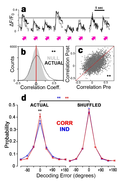 Figure 3. Tectal noise correlations influence network decoding.(a) Recorded responses of two neurons (black and grey) in the same tadpole to eight consecutive presentations of the same stimulus. Responses vary in amplitude around their means (dotted lines). These neurons were noise correlated: variations in amplitude were shared. (b) Distribution of measured pairwise noise correlations (black dotted e) taken over a 1-h stimulation period, and values expected if neurons were independent (gray). Noise correlations were more positive (p<10â5, t-test) and more variable (p<10â8; X2 variance test) than chance. (c) Scatterplot of pairwise linear noise correlations measured in two consecutive 30-min periods. Consecutive noise correlation measurements are correlated (râ=â0.41, p<10â8; linear regression). (d) Distribution of decoding errors under independent and noise correlation decoding of actual response patterns (left) and with responses shuffled for each stimulus type to remove noise correlations (right). Data from seven tadpoles, 277 neurons (b,d), 384 stimulus presentations (c), 192 stimulus presentations each 30 min. Error bars denote SEM. *p<0.05; **p<0.01. |