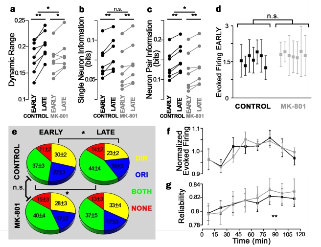 Figure 4. Effects of visual training on single-neuron response properties.(a) Tuning curve dynamic range, the fraction by which a neuron's firing changes in response to different stimuli during early and late epochs. (b,c) Stimulus mutual information conveyed by single neuron (b) and neuron pair (c) firing patterns. Upper asterisks denote difference in the change with treatment. Lower asterisks denote significant change across epochs (paired t-test). (d) Evoked firing rates in control (black) and MK-801 treated (gray) tadpoles during first hour of stimulation. Each point corresponds to a single tadpole; error bars denote standard deviation across neurons within a given tadpole. MK-801 does not acutely affect evoked firing rates (t-test, pâ=â0.61). (e) Proportion of neurons showing direction (yellow), orientation (blue), both (green), or neither (red) selectivity in control (top) and MK-801â(bottom) treated tadpoles, in the first (left) and second (right) hour of stimulation. Asterisks denote significant change across epochs (paired t-test). (f,g) Mean normalized amplitude (f) and response reliability (g) over the course of visual training (black). Reliability increased with training (ANCOVA, p<0.01). Neither measure was affected by MK-801 (gray) (ANCOVA, p>0.05). Reliability is the proportion of evoked responses with amplitude larger than the median spontaneous firing rate. Error bars denote SEM. *p<0.05. |