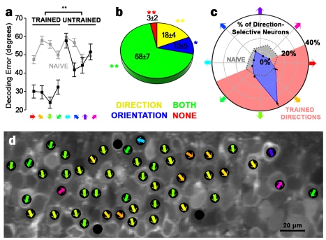 Figure 6. Training-induced changes are stimulus-specific.(a) Decoding error for each direction in tadpoles trained with four of eight stimuli (0â135°), using the correlation decoder. Gray, decoding error of naive control tadpoles. Training-induced decoding improvement is specific to the trained stimuli. (b) Proportion of neurons showing direction (yellow), orientation (blue), both (green), or neither (red) selectivity in tadpoles trained with four stimuli. Asterisks denote significant difference from corresponding proportion in naive control tadpoles. (c) Angle histogram of preferred directions of direction-selective neurons in tadpoles trained with four stimuli. Points are the proportion of neurons with center directions falling between adjacent stimulus directions. Pink shading indicates the trained directions. Responses strongly favored the center of the trained directions (one-sample t-test, p<10â5). Gray dotted line indicates preferred directions in naive control tadpoles. (d) Map of direction selectivity in a tadpole after training with four stimuli. Black circles mark neurons showing significant direction selectivity. Colored arrows mark preferred directions. Error bars denote SEM. (aâc) nâ=â3 tadpoles (152 neurons). *p<0.05; **p<0.01. |