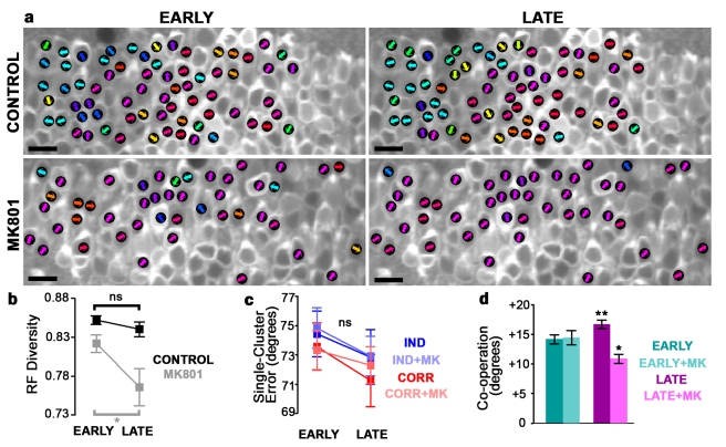 Figure 8. NMDAR-dependent coordination between clusters supports network encoding improvement.(a) Preferred directions of example control (top) and MK801-treated (bottom) tadpoles during early (left) and late (right) epochs. Scale bar = 20 µm. (b) Receptive field diversity across the tectum during early and late epochs, in untreated (black) and MK801-treated (gray) tadpoles. Diversity decreased with training in MK-801–treated tadpoles (paired t-test, p<0.05). (c) Mean decoding error of independent (blue) and correlation-based (red) decoding of single clusters during early and late epochs, in untreated and MK801-treated (lighter shades) tadpoles. (d) Mean decoding cooperation (decoding performance of two clusters taken together minus the maximum decoding performance of either taken alone) during early and late epochs, in untreated and MK801-treated tadpoles. Cooperation increased in control tadpoles and decreased in MK-801 treated tadpoles with training (paired t-tests). Number of clusters: untreated, n = 29; MK801, n = 25 clusters per epoch in seven tadpoles. Error bars denote SEM. Control, n = 7 tadpoles (277 neurons); MK801, n = 7 tadpoles (255 neurons). *p<0.05; **p<0.01. |