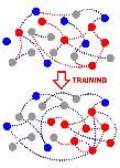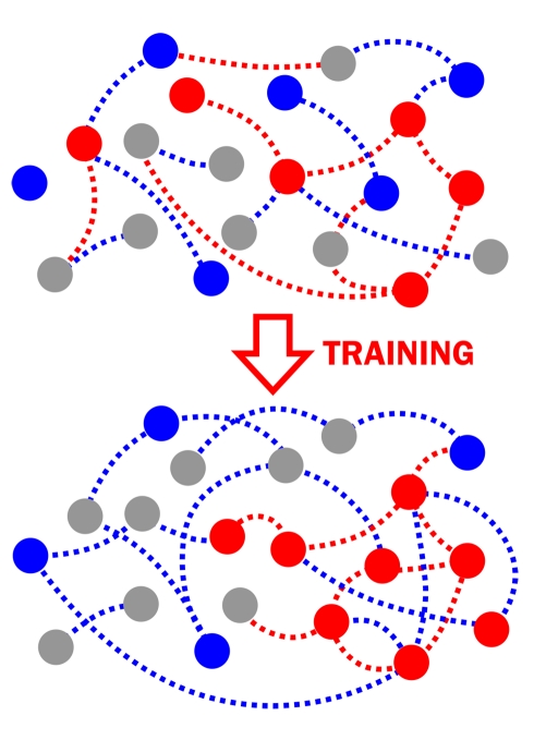 Figure 9. Schematic of receptive field and noise correlation plasticity for trained (red) and untrained (blue) stimuli.Tectal neurons are represented as circles, circle color marks preferred direction (red, down; blue, up), and dotted lines represent noise correlations. Training with down direction increases and clusters receptive fields oriented toward the trained stimuli and decreases long-distance noise correlations (dashed lines). Receptive fields preferring untrained stimuli (blue) are reduced, and noise correlations to these stimuli are increased on all spatial scales. Note that noise correlations can differ across stimuli and are not necessarily determined by neurons' preferred directions. |