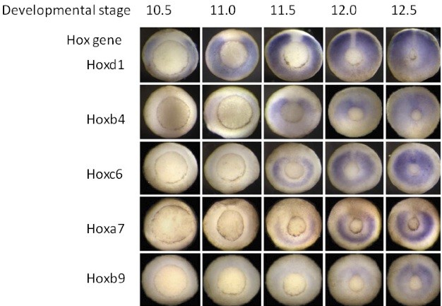 Fig. 4. Temporal collinearity In the Xenopus gastrula. The figure shows Hox ex- pression patterns at sequential stages during gastrulation in Xenopus. The embryos are seen from underneath, where a ring (the blastopore) shows the position where mesodermtissue invaginates during gastrulation. This ring gets smaller as gastrulation proceeds and the upper tissues in the embryo spread out and cover the lower part of the embryo (epiboly). The expression of several different Hox genes, seen as blue colour by in situ hybridisation, is in each case initially in the gastrulamesoderm in the zone above (outside) the ring. Hox expression is thus seen as a blue ring, and since it is initially only in part of the mesoderm, the ring is initially broken. The ring of Hox expression gets smaller as the blatopore ring gets smaller and mesoderm invaginates into the embryo.The figure shows expression of a sequence of Hox genes with differ- ent paralogue numbers, from 1 to 9. It will be seen that the Hox gene with the lowest paralogue number starts expression first and later numbers start sequentially later. It will also be seen that the Hox genes in this time sequence include members of all of the 4 primary vertebrate paralogue groups (a,b,c,d).
