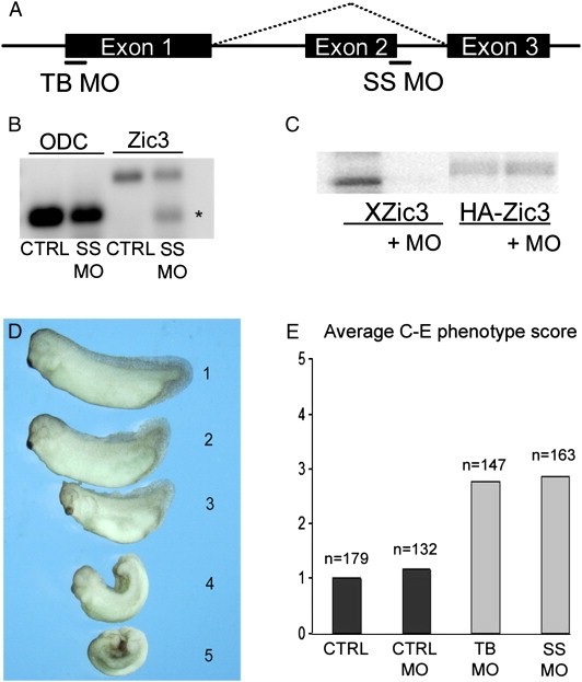 Fig. 1. Knockdown of Zic3 disrupts axial development in Xenopus. (A) Schematic of zic3 exonâintron structure showing translational-blocking (TB) and splice site blocking (SS) morpholino target sites. (B) RT-PCR analysis of zic3 in control (CTRL) and SS MO injected embryos. Asterisk denotes product that lacks exon 2. The top band is the full-length zic3 product. ODC was used as a loading control. (C) In vitro transcriptionâtranslation using Xenopus zic3 (Xzic3) or human HA-ZIC3 expression plasmids in the presence or absence of Zic3 TB MO. (D) Scaling system used to score Xenopus Zic3 morphant phenotypes that ranged from normal (1) to severe dorsal flexion with neural tube defect (5). (E) Average scores of control (CTRL), control morpholino (CTRL MO), Zic3 translational-blocking MO (TB MO), and Zic3 splice site morpholino (SS MO) injected embryos. Number of embryos (n) scored is shown above each injection group.