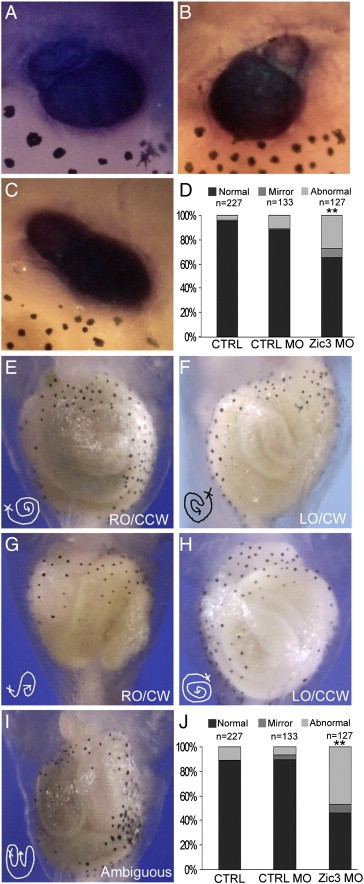 Fig. 5. Reduction of Zic3 expression results in heart and gut abnormalities. (AâC) Ventral view of troponin WISH staining of the heart in Xenopus stage 46 embryos. (A) Normal heart looping with outflow tract from the right side. (B) Mirror phenotype, with outflow tract from the left side. (C) Abnormal heart looping, with no clear laterality of the outflow tract position. (D) Quantification of heart looping phenotypes in controls and Zic3 morphants. (EâI) Ventral view of Xenopus gut coiling in control and Zic3 morphant stage 46 embryos. (E) Normal gut coiling, right origin (RO) and counter-clockwise coil (CCW) direction. (F) Mirror gut coiling phenotype, left origin (LO) and clockwise coil (CW) direction. (G) Normal gut origin with reversed coil direction, clockwise. (H) Mirror gut origin, left side, with normal coil direction, counter-clockwise. (I) Abnormal gut coiling phenotype, no clear origin or coil direction. (J) Quantification of gut coiling phenotypes in control and Zic3 morphants. **p < 0.01 by Fisher's exact test; statistical significance was determined through comparison of control morphants with Zic3 morphants.