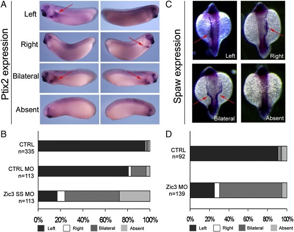 Fig. 7. Abnormal LâR molecular marker expression in Xenopus and zebrafish Zic3 morphants. (A) Pitx2 expression in Xenopus Zic3 morphant embryos at stage 30. Embryos were photographed from both left and right sides. Red arrows highlight pitx2 expression. (B) Quantitative results of pitx2 expression in non-injected control (CTRL), control morpholino (CTRL MO) and Zic3 splice site morpholino (SS MO). (C) Southpaw (spaw) expression in zebrafish Zic3 morphant embryos. Red arrows highlight gene expression as left, right, bilateral or absent. (D) Quantitative results of spaw expression in control and Zic3 morphants.