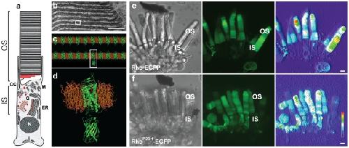 Figure 1. Expression of RhoP23H-EGFP in transgenic Xenopus.(a) Schematic drawing (left) of the Xenopus rod photoreceptor. The inner (IS) and outer (OS) segments, the nucleus (N), the prominent endoplasmic reticulum (ER), Golgi (G), connecting cilium (CC) and mitochondria (M) located apically in the IS are shown. The OS contains numerous stacks of disk membranes. (b) A segment of OS is shown in an electron micrograph. Scale bar, 100 nm. (c) A molecular model of the OS disk membrane (from a segment of a single disk, white box in b). The density of rhodopsin, approximately 90% of the protein in the OS disk membranes [32] is illustrated to scale in the molecular homology model based upon the high-resolution bovine rhodopsin structure [33]. The rhodopsin-phospholipid molar ratio is presented to scale. (e, f) Representative images of sections of live Xenopus retina showing rod cells expressing either Rho-EGFP (e) or RhoP23H-EGFP (f) The DIC image of a small piece of retina (left) and the corresponding three dimensional rendering of a confocal laser scanning z-stack using EGFP detection (middle) are shown. The outer and inner segments are labeled. To illustrate the range of transgene expression, a concentration heat map (red, maximum intensity) is shown (right). Scale bar, 5 µm.