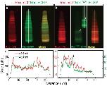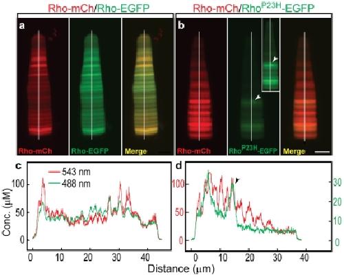 Figure 3. Quantification of transgene expression from dual rhodopsin cassettes in Xenopus rods.(a, b) Measurement of the EGFP and mCherry fluorescence distributions in cells expressing Rho-mCherry/Rho-EGFP (a) and Rho-mCherry-RhoP23H-EGFP (b). Control rods with no fluorescent protein had only background fluorescence which was set to zero. Images show the mCherry (red), EGFP (green) and merged distributions for representative rods. The merged image (a, right) shows synchronized changes in the expression level of both transgenes (Rho- EGFP and Rho-mCherry). The concentration of both proteins is comparable along the rod axis. (b) The RhoP23H-EGFP expression level is significantly lower (b, middle) than the co-expressed wild type Rho-mCherry (b, left). The inset in panel (b, middle) shows the intensified EGFP channel of the original figure to clarify its profile. (c, d) Distributions were measured along the central axis of the cell (white line), converted to concentration using the calibration in Fig. S3 and plotted as a function of distance from the OS base. The dual wild type cassettes are shown in (c) at the same scale for both green and red channels, while for the dual cassette containing RhoP23HEGFP (d), the EGFP values (green) are given on right Y-axis (green) and the mCherry values (red) on left Y-axis. The distance is measured from the base of the rod OS. The arrowhead indicates fluorescent foci in the RhoP23H-EGFP rod. Scale bar, 5 µm.