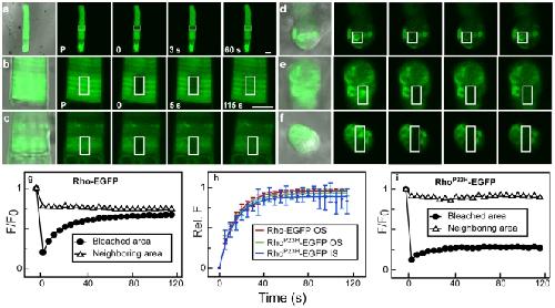 Figure 4. Aberrant mobility of RhoP23H-EGFP measured using fluorescence recovery after photobleaching.(a) Representative low magnification CSLM images of a live rod expressing soluble EGFP show the fluorescence distribution (merged with the DIC image, left) and with the region of interest (ROI) indicated (white box). The cell (P, pretreatment) was photobleached in the ROI (0 s) and the recovery was followed for the indicated time (in seconds). (b–f) Live rods expressing Rho-EGFP or RhoP23H-EGFP were photobleached in different regions and images from different times in the recovery period are shown at higher magnification. The pre-bleach sample is shown as a merge (fluorescence with DIC, left) and with fluorescence alone (P) followed by representative images immediately after bleach (0 s) and 5 s and 115 s post-bleach. The ROI is boxed in each image. Various compartments of the cells were photobleached: (b) base of the OS in cells expressing Rho-EGFP; (c) near the base of the OS in a region with no fluorescent foci in a cell expressing RhoP23H-EGFP; (d) IS in a cell expressing RhoP23H-EGFP; (e) in the OS with fluorescent RhoP23H-EGFP foci; (f) in an axial view of the OS with fluorescent RhoP23H-EGFP foci. (g) The photobleaching recovery profile of panel (b). Integrated fluorescence of Rho-EGFP in the ROI defined in (b), normalized to the integrated fluorescence of the same region in the pre-photobleached image (closed circles) compared to the fluorescence in a neighboring region (open triangles). (h) Integrated fluorescence recovery after photobleaching in regions of RhoP23H-EGFP that showed recovery following photobleaching (c and d). Averaged recovery profiles of photobleached areas in the two groups (c and d) were normalized in order to compare the half-time recovery of the mobile fraction of mutant opsin participating in recovery after photobleaching. Rho-EGFP (red trace) is included for comparison. (i) The photobleaching recovery profile of panel (e) from the ROI (closed circles) and a neighboring area (open triangles). There is no significant change in the fluorescence of the foci on the left of photobleaching box during the recovery period (open triangles). Scale bars, 5 µm.