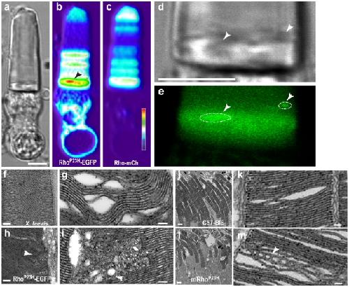 Figure 5. Defects in OS disk membranes in rods expressing RhoP23H-EGFP.(a–e) Images from a rod expressing fluorescent protein from two rhodopsin cassettes: RhoP23H-EGFP and Rho-mCherry (b and c, respectively). Both the heat map representation of RhoP23H-EGFP distribution (b, arrow) and reconstruction images of the cell fluorescence show RhoP23H-EGFP fluorescent foci (e, arrow and dotted lines) near the base of the OS that correspond to inhomogeneous OS disturbances of the DIC image (d, arrows). Scale bars (a–e), 5 µm. (f–i) Electron micrographs of rod OS from transgenic retina expressing either Rho-EGFP (f, g) or RhoP23H-EGFP (h, i). Membranes from RhoP23H-EGFP transgenic animals exhibited vesiculotubular structures (h, i, arrowheads) of similar size to the fluorescent foci found in CSLM imaging. These structures were not observed in micrographs from Rho-EGFP transgenic animals (f). Mechanical disruption of retina prior to fixation (g) showed OS breaks and disk membrane separations but no vesiculotubular structures. Micrographs from four animals were examined for each group. (j–m) Electron micrographs of retina from wild-type (j) or RhoP23H (GHL) transgenic mice (l). Membranes from RhoP23H transgenic animals exhibited vesiculotubular structures (m, arrowheads). Vesiculotubular structures were not observed in micrographs from wild type animals (j, k). Scale bars, 100 nm (g, i, k, m), 200 nm (f, h) and 2 µm (j, l).