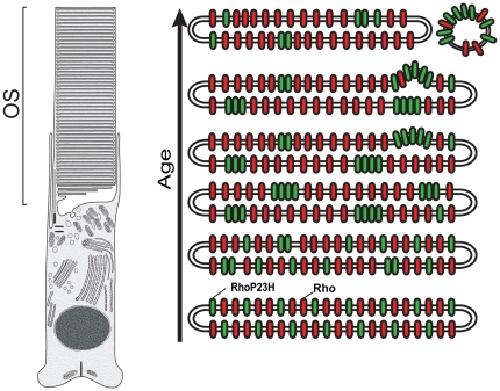 Figure 6. Schematic model to explain OS defect formation in disks that express mutant opsin.Wild type rhodopsin (red) distributes randomly throughout the disk membrane (except incisures which are not shown). In rods expressing RhoP23H (green), there is an initial random distribution of mutant with wild type protein in the disk, although the concentration of mutant protein is much lower than wild type protein. According to this model, over time, the RhoP23H mutant begins to self-associate and form aggregates in the membrane, excluding wild type protein. The resulting mutant protein concentrates in a localized area that causes deformation or defects in the membrane structure, leading to vesiculation and disk breakdown. This could lead to structural instability in the OS, initiating a breakdown and potentially rod death.