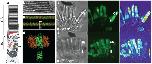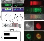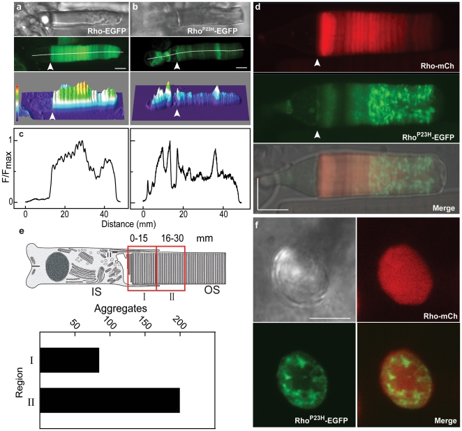 Figure 2. Aberrant expression and aggregation of RhoP23H-EGFP in rod photoreceptors.Confocal images of representative live cells expressing rhodopsin-EGFP fusion proteins show distributions of Rho-EGFP (a) and mutant opsin, RhoP23H-EGFP (b). DIC (top) and fluorescence (middle) images were used to calculate the fluorescence distribution, displayed as a heat map (bottom): red for most intense, green for mid-level and blue for least intense. The border between the IS and OS is indicated by the arrow. (c) The fluorescence profile distribution was computed along the z-spline path through the center of the cell (white line), with the origin arbitrarily set in the nuclear region for each cell. The fluorescence intensity was normalized to the maximum value along the spline. (d) High resolution images of a representative live rod expressing fluorescent protein from two rhodopsin cassettes: Rho-mCherry (red, encoding wild type opsin) and RhoP23H-EGFP (green). The fluorescence intensity profile of two transgenes was determined simultaneously, and the individual distributions (mCherry, top and EGFP, middle are shown together with the distributions merged onto a DIC image (bottom). (e) Quantification of the fluorescent foci in two OS axial locations in live rods expressing RhoP23H-EGFP. The OS was divided into two sections (I and II), comprising ∼60% of the length. The more distal region of the OS was not included to avoid regions prone to swelling or other in vitro damage. The number of isolated fluorescent foci in the outer segment regions was counted in a total of 27 cells from 16 transgenic tadpoles expressing RhoP23H-EGFP. (f) Representative cross-sectional view of an OS from a live rod expressing two rhodopsin cassettes: Rho-mCherry and RhoP23H-EGFP. The z-section for the CSLM was parallel to the rod axis, and the fluorescence from each channel is shown separately and merged. Scale bars, 5 µm.