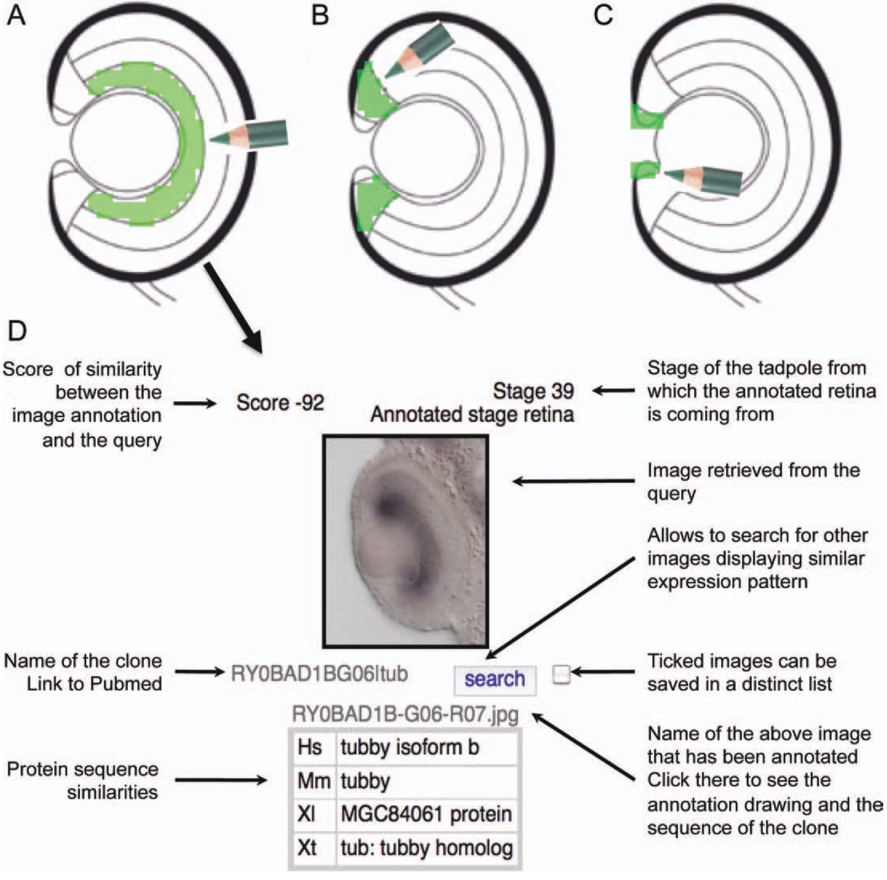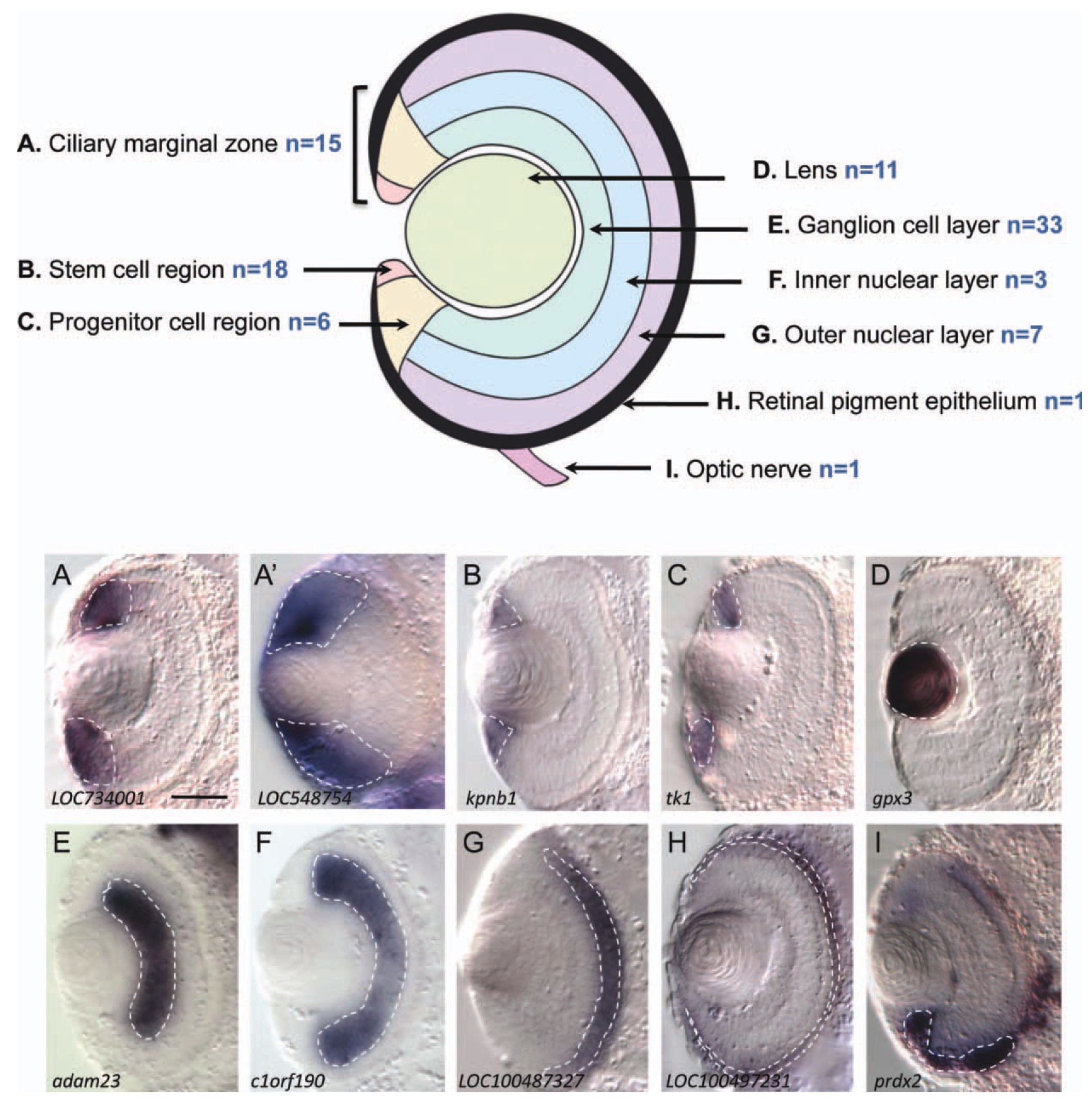Neural stem cell research suffers from a lack of molecular markers to specifically assess stem or progenitor cell properties. The organization of the Xenopus ciliary marginal zone (CMZ) in the retina allows the spatial distinction of these two cell types: stem cells are confined to the most peripheral region, while progenitors are more central. Despite this clear advantage, very few genes specifically expressed in retinal stem cells have been discovered so far in this model. To gain insight into the molecular signature of these cells, we performed a large-scale expression screen in the Xenopus CMZ, establishing it as a model system for stem cell gene profiling. Eighteen genes expressed specifically in the CMZ stem cell compartment were retrieved and are discussed here. These encode various types of proteins, including factors associated with proliferation, mitotic spindle organization, DNA/RNA processing, and cell adhesion. In addition, the publication of this work in a special issue on Xenopus prompted us to give a more general illustration of the value of large-scale screens in this model species. Thus, beyond neural stem cell specific genes, we give a broader highlight of our screen outcome, describing in particular other retinal cell markers that we found. Finally, we present how these can all be easily retrieved through a novel module we developed in the web-based annotation tool XenMARK, and illustrate the potential of this powerful searchable database in the context of the retina.