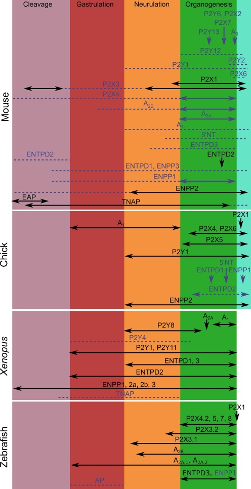 Fig. 2. Temporal pattern of expression of the purinergic signalling components in mouse, chick, Xenopus and zebrafish embryos. The extent of expression of purinergic receptors and ectonucleotidases is mapped along the major phases of embryogenesis, cleavage, gastrulation, neurulation and organogenesis and embryo growth that have been normalized in duration for the four model organisms to allow easier comparison. The expression of some of these genes has only been described at one stage (indicated by arrows). EST expression data is indicated by blue dashed lines and corresponding gene names in blue. The expression of mouse genes published in [25] or [26] as part of the embryonic mouse database and atlas of gene expression are indicated by solid blue lines. The murine P2Y1 expression by in situ hybridization is available on the MGI website |