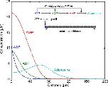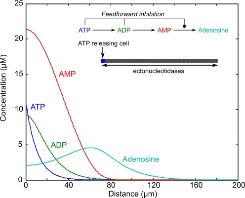 Fig. 3. Simulation of diffusion and metabolism of ATP—a complex purinergic morphogenetic field. The simulation (values shown at T = 5 s after beginning) shows that ATP and ADP are locally high in concentration over the first 30–40 μm, but that adenosine peaks at around 60 μm and remains high in concentration up to around 120 μm. Thus a complex pattern is produced where the potential for ATP/ADP actions is bounded and limited by a zone where adenosinergic actions have the potential to predominate. The simulation considers a short strip of cells (inset) where one cell at the end releases ATP; the ATP is then converted successively through the intervening intermediates to adenosine, with feed-forward inhibition of the final step mediated by ATP and ADP (inset top). All the metabolites diffuse along the strip with the same diffusion coefficient (300 μm2/s). The conversion of ATP and metabolites are described by Michaelis–Menten kinetics, based on literature values [93–95]: ATP, Km 33.3 μM, Vmax, 100 μM/s; ADP, Km 9.5 μM, Vmax 20 μM/s; AMP, Km 0.94 μM, Vmax, 20 μM/s; both ATP and ADP inhibit the conversion of AMP to adenosine (Ado) with a ki of 0.1 μM. The simulation is based on the following parallel linked equations: ∂[ATP]/∂t = D ∂2[ATP]/∂x2 − k1[ATP]; ∂[ADP]/∂t = D ∂2[ADP]/∂x2 + k1[ATP] − k2[ADP]; ∂[AMP]/∂t = D ∂2[AMP]/∂x2 + k2[ADP] − k3.ki[AMP]; and ∂[Ado]/∂t = D ∂2[Ado]/∂x2 + k3.ki[AMP]. Where D is the diffusion coefficient, and k1, k2 and k3 are rates based on the Michaelis–Menten kinetics given above. These equations were solved numerically using code written for Matlab. We thank Dr. Magnus Richardson for assisting us with this code |