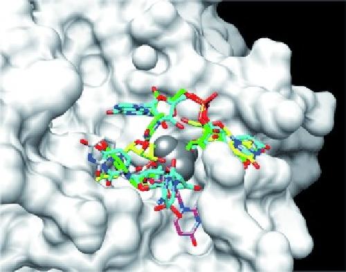 Figure 1. AutoDock proposed conformations of various XendoU substrates/ligands. 3â²âUMP (light grey), 2â²,3â²âcyclicâUMP (magenta), UU (yellow), UUU (green) and CUUG (cyan). The van der Waals surface of XendoU is shown in white. The phosphate is shown in dark grey.