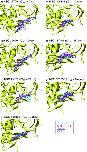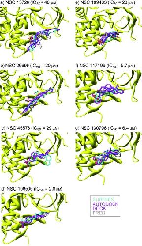 Figure 3. Docked conformations of the XendoU inhibitors. A portion of the XendoU enzyme is displayed as a yellow ribbon. Surflex, AutoDock, Dock and FRED overlapped poses of a)â NSC 13728 (1), b)â NSC 26699 (2), c)â NSC 45576 (3), d)â NSC 106505 (4), e)â NSC 109483 (5), f)â NSC 117199 (6) and g)â NSC 130796 (7) are shown, and their IC50 values are given.