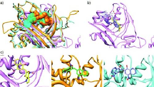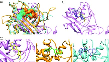 Figure 6. Binding mode comparisons of the XendoU/PP11 common, active compounds docked in the three RNAses. a)â NendoU (pink), XendoU (cyan) and PP11 (orange) cumulative binding surfaces of the XendoU/PP11 common inhibitors (NCS 130796, NCS 106505, NCS 45576 and NSC 13728). b)â AutoDock proposed binding conformations of the XendoU/PP11 active compounds into the NendoU opened form (PDB: 2H85[21]): NSC 13728 (1; purple), NCS 45576 (3; blue), NCS 106505 (4; white), NCS 130796 (7; yellow). c)â Binding mode comparison of NCS 130796 (7) docked in NendoU (pink), PP11 (orange) and XendoU (cyan).