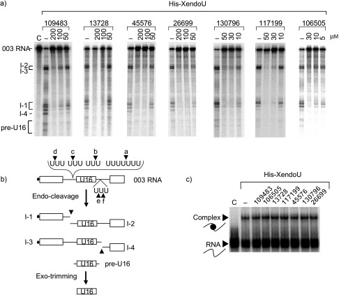 Figure 2. Functional validation of XendoU inhibitors 1â7. a)â XendoU processing activity was analyzed in the presence of the best performing individual compounds (indicated above each lane). 32Pâlabeled 003â RNA was incubated with HisâXendoU alone (lanes â) or in the presence of decreasing amounts of inhibitors, at the specific concentrations. Untreated sample (input RNA) was fractionated in lane C. b)â Schematic representation of U16 snoRNA processing. U16 primary transcript (003â RNA) as well as the complementary cleavage products (Iâ1 and Iâ2; Iâ3 and Iâ4) released by XendoU endonucleolytic clevages upstream (a, b, c and d sites) and downstream (e and f sites) of the U16 snoRNA are depicted. The double cleavage upstream and downstream of the U16âcoding region produces preâU16 molecules that, in the cell system, are converted by exonuclease trimming to the mature snoRNA. c)â XendoU binding activity was tested in the presence of inhibitors. HisâXendoU was incubated with a fixed amount of 32Pâlabeled mini 003 RNA alone (lane â) or in the presence of each compound at a concentration of 200â μm. RNA incubated in buffer alone was loaded in lane C. Arrowheads point to free RNA (RNA) and protein/RNA complex (Complex).