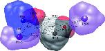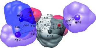 Figure 4. Pharmacophore model derived from XendoU inhibitors. The surfaces derived from the most active compounds (4, 6 and 7) are colored in red, blue and grey. The peculiar areas from the less active agents (1â3 and 5) are depicted in purple. The hydrophobic features (HYâ1, â2, â3 and â4) and the hydrogen acceptors (HAâ1 and â2) are also indicated. Interaction (â) distances are given in angstroms (Ã ).