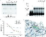 Figure 5. Analysis of inhibition of human PP11. a)â Cleavage assay: in vitro processing reaction was performed by incubating 5â²âendâlabeled P1 oligoribonucleotide (run as untreated molecule in lane C) with HisâPP11 alone (lane â) or in the presence of each inhibitor at a concentration of 200â μm. The sequence of P1 oligoribonucleotide, as well as the PP11cleavage sites (indicated by arrows), are reported below. b)â Doseâdependent inhibition assay of the four PP11 inhibitors. c)â Binding assay: the four compound (1, 3, 4 and 7) that inhibit PP11cleavage activity were further tested for their ability to affect PP11 binding properties. A mobility shift assay was performed as already described for XendoU. HisâPP11 was incubated with a fixed amount of 32Pâlabeled RNA alone (lanes 3 and 4) or in the presence of each compound at a concentration of 200â μm (lanes 5â8). Untreated RNA was fractionated in lanes 1 and 2. The arrows point to the RNAâprotein complex (Complex) or to the free RNA (RNA). d)â Docked conformations of the PP11 inhibitors: NSC 13728 (1; cyan), NSC 45576 (3; purple), NSC 106505 (4; yellow), NSC 130796 (7; green). The van der Waals surface of PP11 is shown in white.