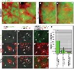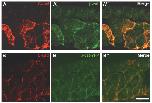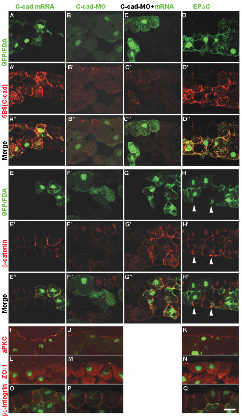 Fig. S2. Changes in expressions after injection of C-cadherin mRNA, C-cad-MO or EPDC mRNA. C-cadherin mRNA (C-cad, 500 pg/blastomere), C-cad-MO (10 ng/blastomere) or EPDC mRNA (500 pg/blastomere) was injected animally into two of 4 blastomeres (labeled by co-injection of GFP, b-gal mRNA or FDA). Embryos were fixed at stage 10.5, sectioned and immunostained with C-cadherin (A-D), b-catenin (E-H), aPKC (apical marker, I-K), ZO-1 (marker for tight junction, L-N) or b1-integrin (basolateral marker, O-Q) antibody. C-cadherin protein expression is increased by the mRNAs (A-A0,D-D0), and decreased by the morpholino (B-B0) which is rescued by C-cadherin mRNA (C-C0). b-catenin protein density at the membrane is increased by C-cadherin mRNA (E-E0), and decreased by C-cad-MO (F-F0) which is rescued by C-cadherin mRNA (G-G0). EPDC mRNA does not change b-catenin expression except at the boundary with normal cells where the signal is stronger (H-H0, arrowheads). Expression of aPKC, ZO-1 and b1-integrin proteins do not differ from unlabeled control cells, indicating that epithelial polarity is not affected by modulation of C-cadherin expression. Apical to the top. Scale bar: 20 um. |