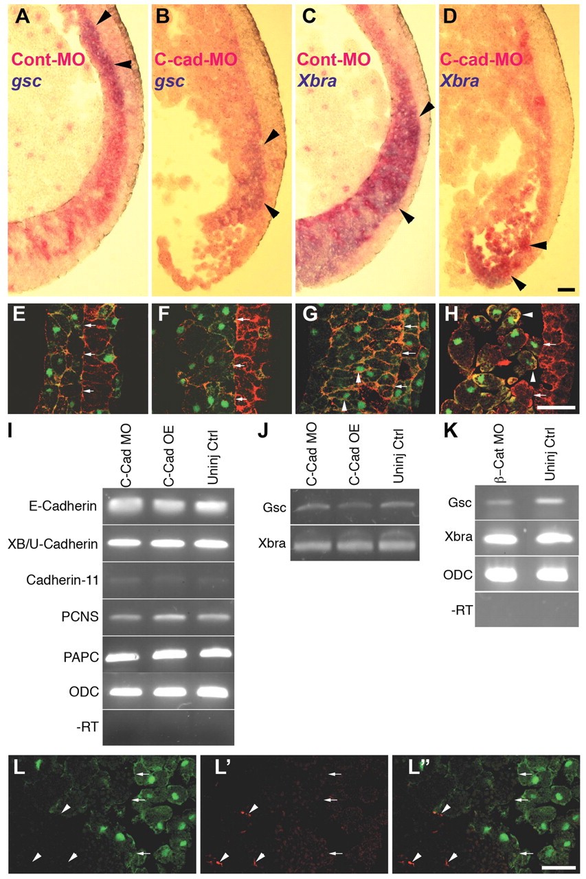 Fig.1. Effects of C-cad-MO. (AâH) Late gastrula sagittal sections, after dorsovegetal injection of control MO or C-cad-MO (40 ng/embryo). (AâD) In situ hybridization. gsc-expressing anterior mesoderm (arrowheads, A,B, dark purple); Xbra-expressing chordamesoderm (arrowheads, C,D). Injected cells, magenta. (EâH) High magnification, injected mesoderm cells (green) counterstained for actin (red). Brachet's cleft (arrows) separates mesoderm (left) and ectoderm (right). Tightly packed cells in control MO (E) and C-cad-MO (F) anterior mesoderm. Chordamesoderm cells are spindle-shaped in controls (arrowheads, G), but rounded in C-cad-MO embryos (arrowheads, H). (I) RT-PCR for cadherins and protocadherins in embryos injected with C-cad-MO (40 ng) or C-cadherin mRNA (2 ng). (J,K) RT-PCR to show gsc and Xbra expression after C-cad-MO or C-cadherin mRNA (J) or β-catenin MO (K; 6 ng/embryo) injection. (LâLâ²) β-catenin membrane localization is reduced by C-cad-MO (10 ng) in anterior mesoderm. β-catenin staining (Lâ², red, arrowheads) in C-cad-MO cells co-injected with GFP mRNA (L, green; Lâ², merged). Anterior mesoderm is to the left of Brachet's cleft (arrows). Scale bars: 50 μm. |