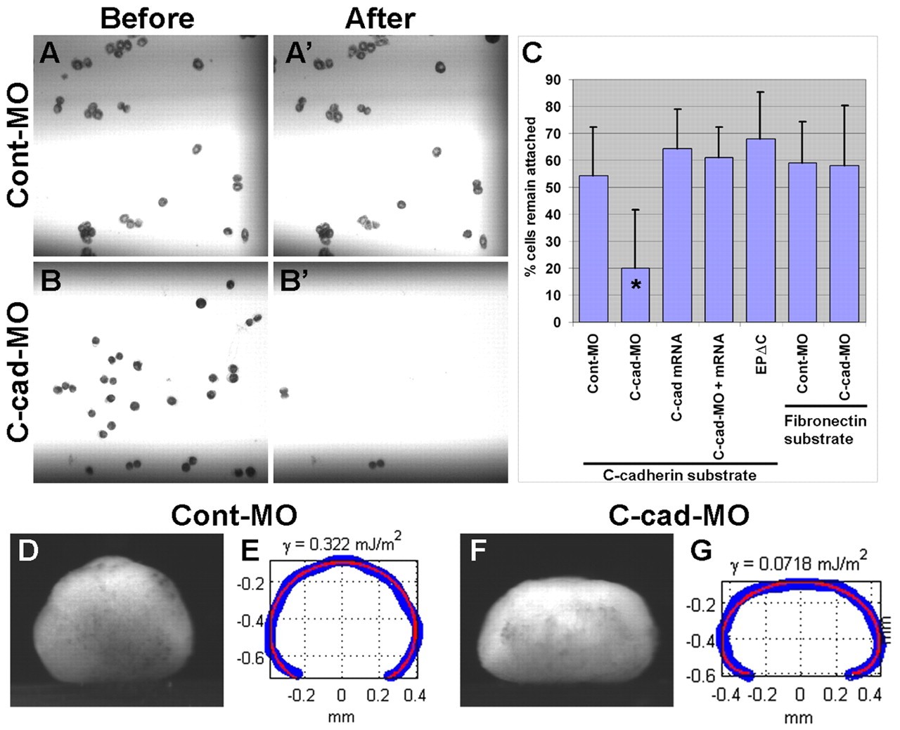 Fig.2. Adhesiveness of ectoderm cells. (AâC) Cells on C-cadherin-Fc substratum before and after dish inversion: (A,Aâ²) control MO-injected cells; (B,Bâ²) C-cad-MO cells (10 ng/embryo); (C) fraction of cells remaining attached. *Ratio significantly different from control condition (P<0.05). (DâG) Surface tensions of ectoderm. (D,F) Side view of aggregates after 2 hours. (E,G) Drop shapes (red lines) were fitted to scanned outlines of aggregates (blue) by axisymmetric drop shape analysis (ADSA). (D,E) Control; (F,G) C-cad-MO aggregates. |