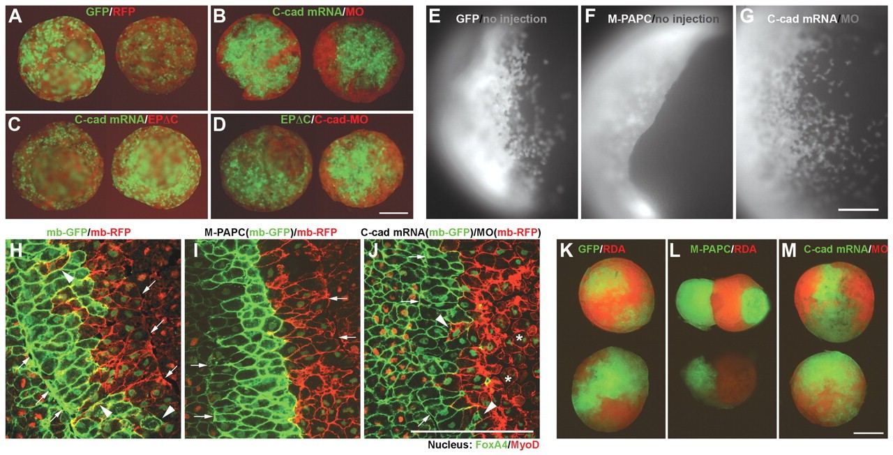 Fig.3. Cadherin expression and sorting. (AâD) Mixed and reaggregated ectoderm cells at the neurula stage. C-cad-MO (10 ng/embryo) cells sort from C-cadherin or EPδC cells (B,D); C-cadherin and EPδC cells do not segregate (C), similar to controls (A). (EâG) Ventral ectoderm C-cadherin and C-cad-MO cells do not segregate in vivo (G), similar to controls (E); M-PAPC-injected cells separate from normal cells (F). (HâJ) Chordamesoderm cell intercalation in the late gastrula. C-cadherin and C-cad-MO cells intercalate (J, arrowheads) as in controls (H, arrowheads). C-cad-MO cells are abnormally round (asterisk). Intercalation does not occur between M-PAPC-expressing and uninjected tissue (I). Nuclei were immunostained with FoxA4 (chordamesoderm) and MyoD (paraxial mesoderm) antibodies. Arrows indicate the notochordâsomite boundary. (KâM) Explantation does not induce sorting. Inner ectoderm isolated from early gastrulae, cultured to the neurula stage. The C-cadherinâC-cad-MO boundary (M) resembles that of the negative (K), rather than positive (MâPAPC injection, L) control. Scale bars: 200 μm. |