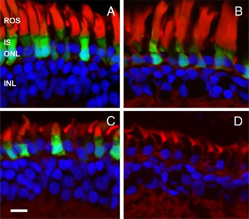 Dysmorphic bP23H rod photoreceptors with truncated outer segments identified via GFP fluorescence. Representative confocal micrographs of two different models of retinal degeneration before (top) and after (bottom) degeneration. A, C, bP23H/GFP double-transgenic retinas. GFP was coexpressed in the rods of bP23H tadpoles to label rod photoreceptors. A, Dark-reared bP23H/GFP retina. C, Degenerating bP23H retina after 6 weeks in cyclic light. Note the presence of GFP-positive rod cell bodies with severely truncated outer segments. B, D, iCasp9/GFP double-transgenic retinas. B, iCasp9/GFP retina before induction of apoptosis. D, iCasp9/GFP retina 4 d after administrating 10 mM AP20187. Rod photoreceptors are permanently lost and noticeably absent after drug-induced apoptosis. Sections were stained with Alexa Fluor 555-conjugated WGA to visualize membranes (red) merged with Hoechst nuclear stain (blue). Rod photoreceptors were visualized by GFP expression (green). IS, Inner segment; |