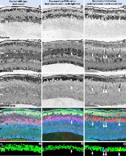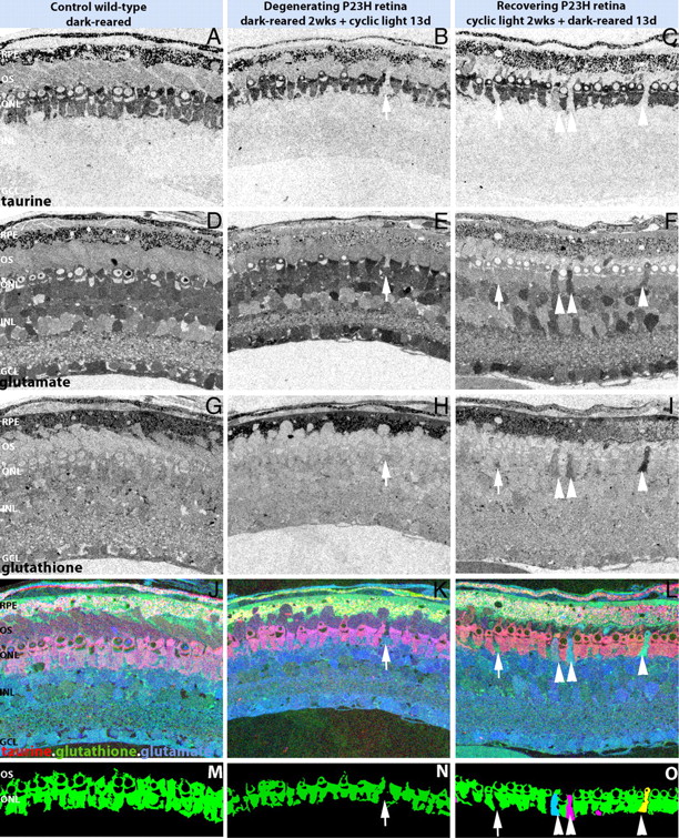 Short-term metabolic changes in bP23H retinas. AâI, Visualization of metabolic content and distribution by quantitative metabolite mapping on 90 nm sections probed with Igs specific to each metabolite and visualized with silver intensification. JâL, Redâgreenâblue channels represent taurineâglutathioneâglutamate mapping. The pink and red compartments in the photoreceptor outer segments (OS) and inner segments (IS) contain distinct taurineâglutamateâglutathione mixtures, whereas various blue-to-azure cells in the interneuron layer (INL) and ganglion cell layer (GCL) are neurons with distinctive glutamate content. The greenâyellow background of RPE reflect high levels of glutathione. MâO, Theme maps display results of multispectral analyses and clustering analyses to extract all distinct molecular phenotypes in the photoreceptor layer. Signals from glutamate, glutathione, taurine, aspartate, GABA, glycine, arginine, alanine, and CRALBP were used for multispectral analyses and clustering analyses. M, N, Theme maps show that the metabolic profiles of rods and cones in control and degenerating retina were similar; whereas in recovering retina, rods displayed variability in their metabolic profile because of variability in their taurine, glutamate, and glutathione content. Arrows and arrowheads indicate Müller glia and regenerating rods, respectively. |