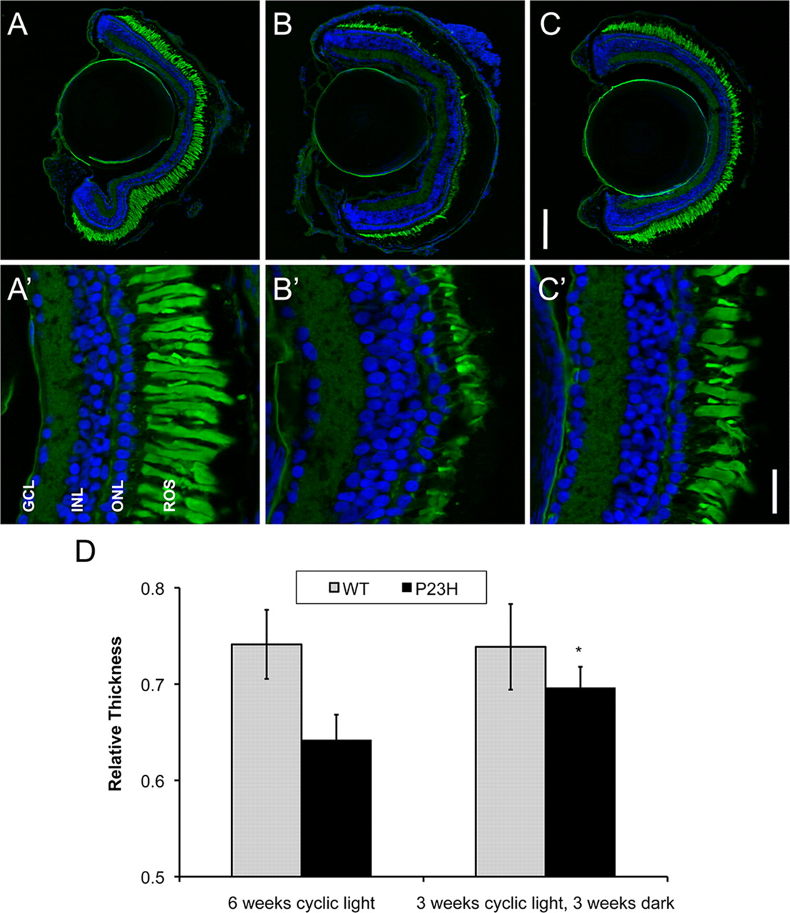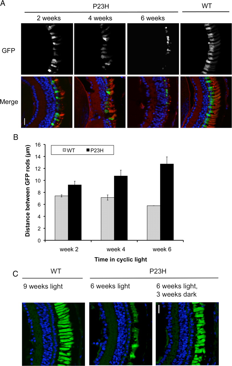 Dysmorphic rhoP23H rod cells are able to regenerate in the dark. A, Dysmorphic rod cells can be observed in the degenerating bP23H retina for up to 6 weeks in cyclic light-rearing conditions. Sections were stained with Alexa Fluor 555-conjugated WGA to visualize membranes (red) merged with Hoechst nuclear stain (blue). Rod photoreceptors were visualized by GFP expression (green). B, Relative density of GFP-positive rods in the central retina over time (n = 3, mean ± SEM). C, bP23H rod cells are able to regenerate outer segments lost after 6 weeks in cyclic light. Cessation of degenerating light signal reverses ROS degeneration. Sections were stained with WGA to visualize membranes (green) merged with Hoechst nuclear stain (blue). Scale bars, 20 μm. WT, Wild type. |