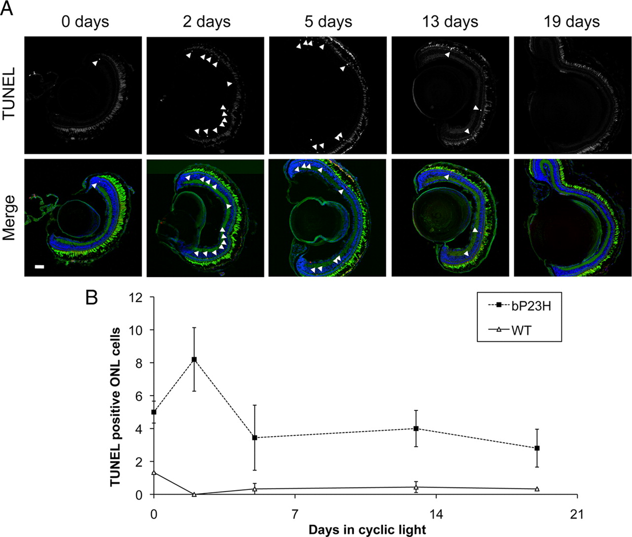 Short-term degeneration of bP23H retinas over a 3 week period as monitored by TUNEL. Tadpoles were allowed to develop for 14 d in complete darkness. At 14 dpf, the animals were moved to cyclic light (12 h light/dark cycle) rearing condition. A, TUNEL-stained (red) retinal sections of animals at 2, 5, 13, and 19 d in cyclic light. TUNEL-positive cells in the ONL are indicated by arrowheads. WGA, Green; Hoechst nuclear stain, blue. Scale bar, 100 μm. B, The number of TUNEL-positive cells in the ONL were counted over the 3 week cyclic light period. Graph represents the number of TUNEL-positive ONL cells per cryosection, averaged over at least three samples per time point (n > 3, mean ± SEM). For each sample, TUNEL-positive cells were counted in three sections obtained from the center of the tissue block. WT, Wild type. |