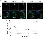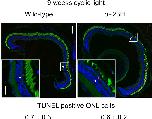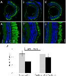 Apoptosis in bP23H retinas reared in cyclic light is comparable with WT retinas in cyclic light. Comparison of wild-type retina (left) versus bP23H retina (right) after 9 weeks in cyclic light. The arrowheads point to TUNEL-positive (red) ONL cells. Insets show enlargements of respective boxed areas. The number of TUNEL-positive cells in the ONL were counted over a 9 week period. The highest number of TUNEL-positive ONL cells per section per retina at week 9 is shown (n > 3, mean ± SEM). WGA, Green; Hoechst nuclear stain, blue. Scale bars: 100 μm; inset, 10 μm. |