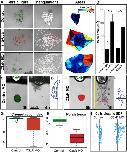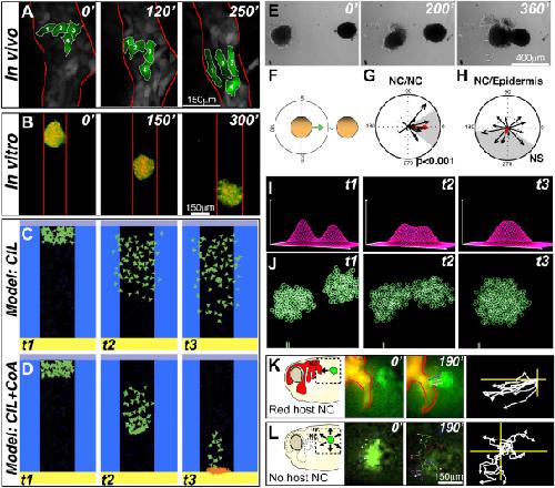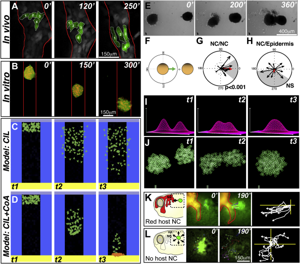 Figure 1. NC Cells Exhibit Mutual Cell Attraction(A) NC migration in vivo in a zebrafish embryo (time in minutes). Colored cells show that they maintain their neighbor relations during migration in vivo.(B) In vitro Xenopus migratory NC cell cluster showing spontaneous collective migration in a restricted space.(C and D) Temporal evolution of a computer model that shows that CIL alone leads to cell dispersion (C), but if an attractive interaction (coattraction [CoA]) counterbalances CIL, collective migration may emerge (D). Cells are allowed to migrate in the black zone and repelled by the blue borders. They stop moving when they reach the bottom and turn orange.(E) NC explants attract each other in vitro.(F) Quantification method to determine CoA vector.(G and H) CoA vector plots. NC/NC confrontation pairs show significant CoA (G; p < 0.001; n = 36), but NC/Epidermis pairs do not (H; NS, n = 12). NS, not significant. Red arrow shows average vector. Gray area indicates circular dispersion.(I and J) Temporal evolution of a computational model showing that CoA is feasible. (I) Profiles of the attractant concentration. (J) Spatial distribution of two groups of particles. Note that the two groups move toward each other.(K and L) CoA in vivo. Left panel shows experimental scheme. Middle panels illustrate start and end point. Right panel indicates centered tracks. Grafts of labeled NC cells (green) join endogenous (red) NC cells (K; 77%; n = 13) but disperse radially when grafted in embryos without NC cells (L; 0%; n = 15).See also Figure S1 and Movies S1, S2, and S3. |