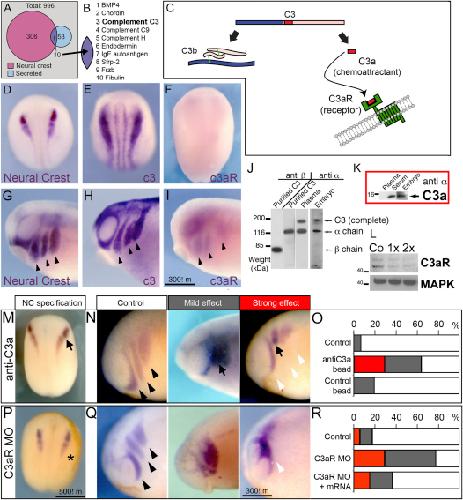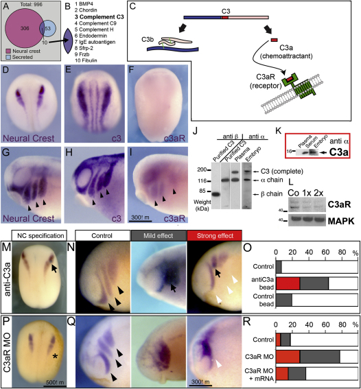 Figure 2. C3a and C3aR Are a Chemotactic Pair, Both Produced and Sensed by NC Cells and Required for NC Migration(A) Venn diagram of genes expressed in the NC (pink) and that encode secreted proteins (light blue), from a total of 996 genes (gray) whose expression patterns during Xenopus development have been previously determined (Pollet et al., 2005).(B and C) Ten candidate genes were found (purple) (B). From these genes C3 was particularly interesting because when it is cleaved, it releases a chemotactic peptide C3a that binds to its receptor C3aR (C).(D–F) Premigratory NC stages. (D) Expression of NC markers snail2 and twist. (E) C3 expression in the NC. (F) C3aR in situ hybridization showing no NC expression.(G–I) Migratory NC stages. Arrowheads indicate migratory streams. (G) Expression of NC markers snail2 and twist. (H) C3 expression. (I) C3aR expression.(J and K) C3 proteins. C3 (J) and C3a (K) are detected by western blot. Lanes are loaded with purified proteins or Xenopus extracts as indicated. Anti-α and anti-β are specific antibodies for corresponding C3 chains.(L) C3aR western blots of Xenopus extract injected with a control MO (Co) or different doses (1×, 2×) of C3aR MO. Note the decrease in C3aR protein by the C3aR MO.(M–R) Analysis of cell migration via in situ hybridization. Embryos treated with a bead soaked in antiC3a (black arrow) to inhibit C3a (M–O) or with C3aR MO (asterisk) to block C3aR (P–R) were fixed at NC specification (M and P) or migration stages (N and Q). Then, NC specification and migration were assessed using the expression of snail and twist, genes specifically expressed in NC cells. (M) C3a inhibition does not affect NC specification. (N) Range of effect in NC migration after C3a inhibition. (O) Quantification of the phenotypes as percentage of the total. Note the specificity of the treatment because beads coated with control antibodies do not significantly affect NC migration (n > 20 for all cases). (P–R) Similar to (A)–(C) but after treatment with C3aR MO. Note the rescue of C3aR mRNA showing the specificity of C3aR MO (R).See also Figure S2. |