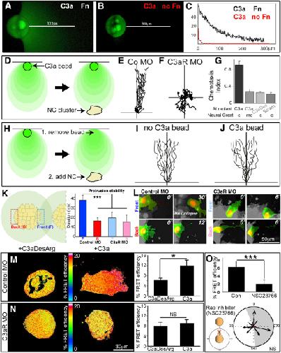 Figure 3. C3a Works as a Neural Crest Chemoattractant(AâE) C3a forms a stable gradient on fibronectin. Under saline medium, beads (C3a-coated or not) were placed on silicone grease on a surface with or without fibronectin. After 1â3 hr, the surface was carefully washed and then C3a was detected using immunofluorescence. Note that no signal was observed in the absence of C3a or of the C3a primary antibody (not shown). (A) C3a forms a gradient on fibronectin. (B) Similar to (A), but the C3a-soaked bead was placed on a surface without fibronectin. Note that no C3a is detected outside the bead region. (C) Quantification of fluorescence level for ten different beads. The x axis shows distance to the bead in micrometers (μm), and the y axis indicates fluorescent intensity, in arbitrary units. (DâJ) C3a is a NC chemoattractant. (D) Experimental design. C3a beads were fixed on fibronectin, and NC cells were cultured next to the bead. (E) Tracks of control MO NC clusters exposed to a C3a source (chemotaxis index [CI], 0.987; p < 0.001).(F) Tracks of C3aR MO NC clusters exposed to a C3a source (CI: 0.211; not significant).(G) Summary of the CI for different treatments. Control (c) or C3aR morphant (mo) NC cells were used. At least three experiments for each condition were performed.(HâJ) Stability of the C3a gradient. (H) Experimental design. A C3a bead was placed on a fibronectin surface for 1â3 hr, which suffice to establish a gradient (A and C). Next, the bead was removed, and a NC cluster was placed next to the position where the bead was. Then, time-lapse and tracking of migrating cells were performed (I). As a control, tracks of NC cells where the C3a bead was not removed are shown (J). No difference in NC chemotaxis was observed between migration to C3a-coated beads and through the C3a bound to fibronectin only.(K and L) Confronted explants stabilize protrusions in a C3a-dependent manner. (K) Stability of cell protrusions was measured and compared between cells at the front and back, as shown in the cartoon on the left. Note that the difference between front and back cells is lost when C3aR is blocked (âââp < 0.001). (L) Representative images of recently formed protrusions and the time when they collapsed under the different conditions. Note that control front protrusions remain stable for more than 30 min.(MâO) C3a regulates Rac activity. (M and N) Rac1 activity analyzed by FRET. (M) Representative cases of control and c3a-treated cells are shown. Note the polarized Rac1 activity in the C3a condition. Percentage (%) of FRET efficiency (p < 0.05; control n = 19, C3a n = 17). Note that this method may alter cell morphology. (N) C3aR morphant cells were treated with a control peptide (C3aDesArg) or C3a. No difference in FRET efficiency was observed, indicating that the response to C3a is C3aR dependent. (O) Rac activity analyzed by FRET after treating NC cells with the Rac inhibitor NSC23766, showing an efficient Rac inhibition. Vector plot showing loss of coattraction after Rac1 inhibition.Error bars in (G) and (M)â(O) correspond to the standard deviation from the mean. See also Movie S4. |